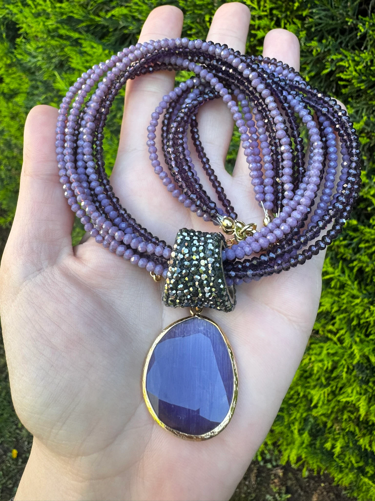 Kolyemizde küçük kristal boncuklar ve el yapımı aparat kullandık. Kedi gözü kolye ucu ile tamamladığımız kolyemiz yaklaşık 43 cm dir. Uzatma zinciri mevcuttur.
